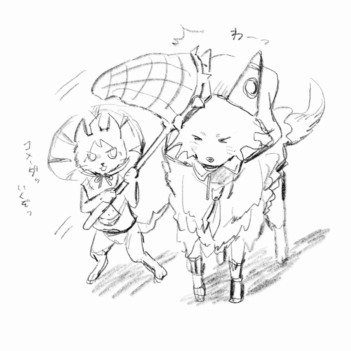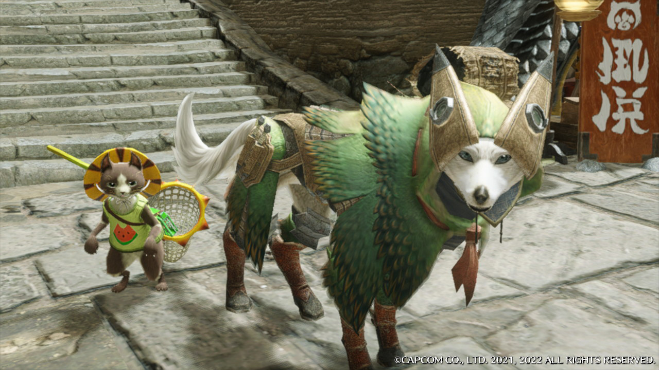 モンハンライズを最近始めまして、キャラクリで似せてつくったアイルー(名:ヒナータ)とガルク(名:コメーダ)の、狛日概念のような何かです。