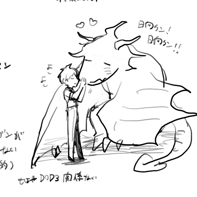 1枚目はDOD3に感化されてらくがきした龍化狛×人間日です。この設定でもっとちゃんとしたの描きたい。